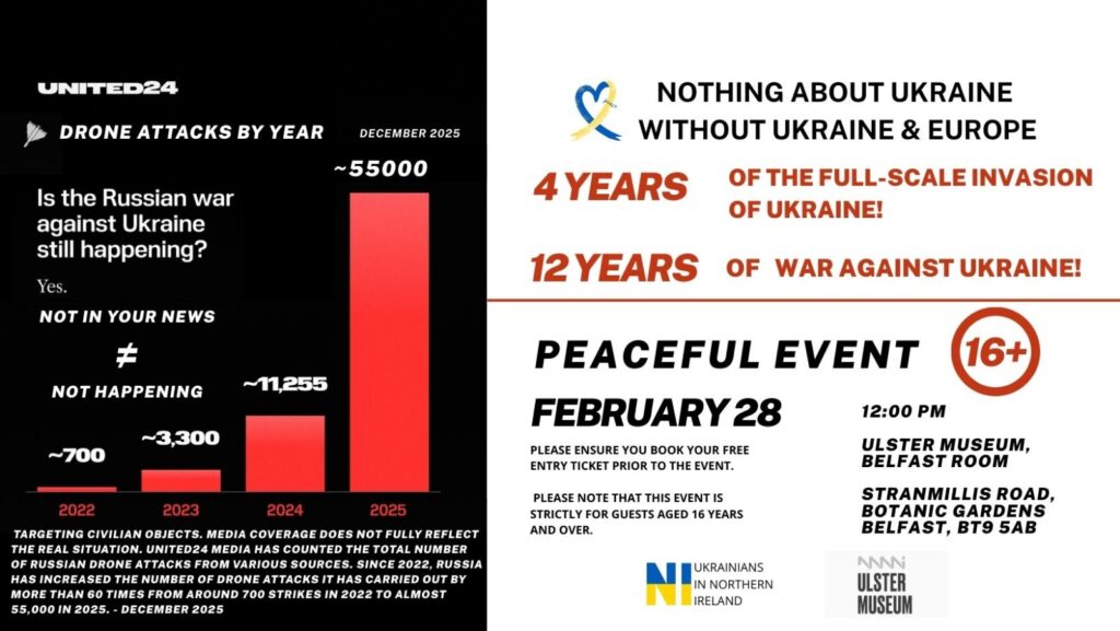 The Honorary Consul for Ukraine in Northern Ireland is please to accept the invitation by the Ukrainians in NI charity to attend this important event marking the exceptional courage and resilience of the people of Ukraine on the 4th anniversary of the full scale invasion of Ukraine by a cruel aggressor: